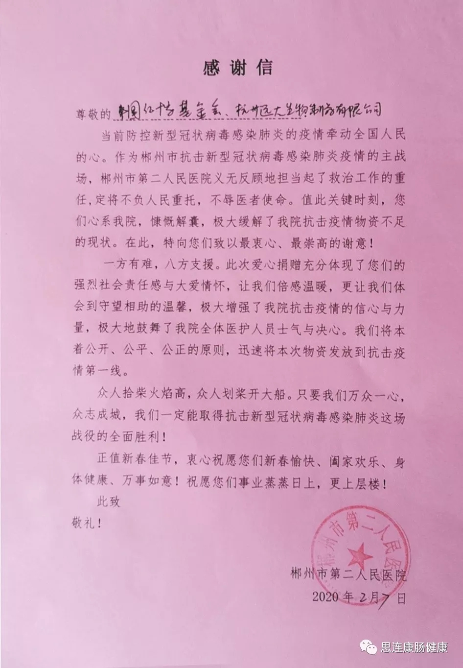 郴州市第二人民医院发来感谢信