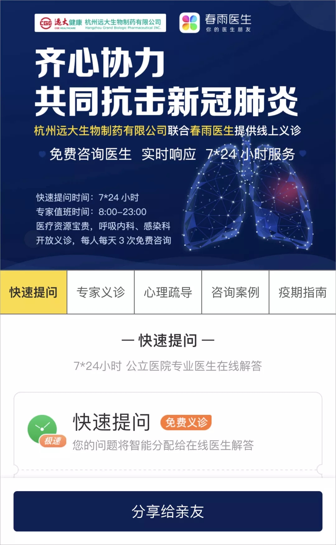 杭州远大生物制药有限公司联合国内多家知名医疗在线垂直领域问诊平台春雨医生、快速问医生、妙手医生共同发起免费在线义诊活动