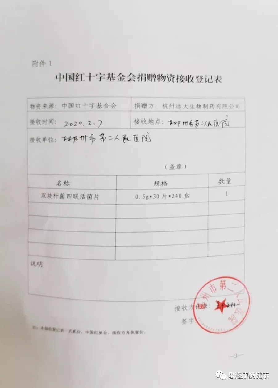 在得知防疫一线急需微生态药品后,2020年2月6日,杭州远大生物制药有限公司立即启动捐赠程序,决定第一批捐赠价值100万元的双歧杆菌四联活菌片(思连康),专项用于疫区新型冠状病毒肺炎的防治。目前第一批价值100万元双歧杆菌四联活菌片(思连康)已全部送达湖北、浙江、湖南等地医院;第二批价值130万元的思连康(双歧杆菌四联活菌片)也已于昨日(2月12日)开始配送医院。