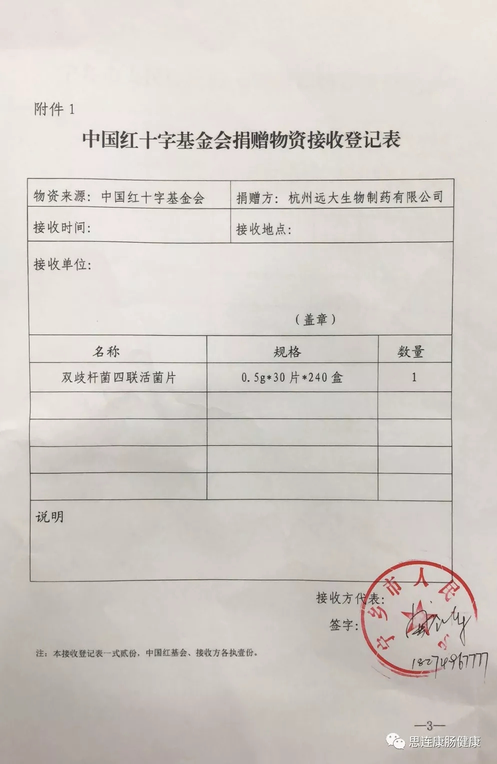 郴州市第二人民医院发来中国红十字基金会捐赠物资接收登记表确认已经收到捐赠药品。