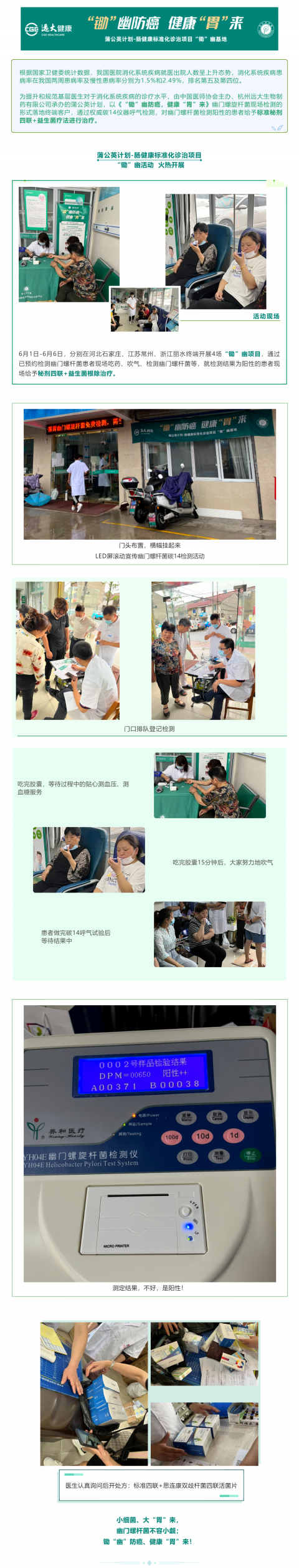 为提升和规范基层医生对于消化系统疾病的诊疗水平,由中国医师协会主办、杭州远大生物制药有限公司承办的蒲公英计划,以《“锄”幽防癌,健康“胃”来》幽门螺旋杆菌现场检测的形式落地终端客户,通过权威碳14仪器呼气检测,对幽门螺杆菌检测阳性的患者给予标准秘剂四联+益生菌疗法进行治疗。